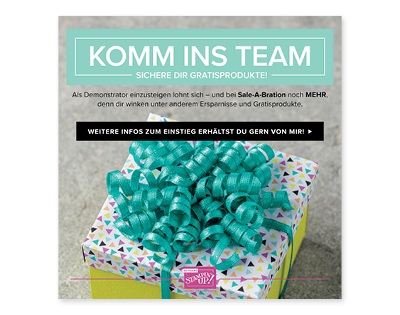 Ihr möchtet auch Teil einer tollen Stempelfamilie sein, wollt vielleicht für Euch günstiger an die tollen Produkte von Stampin’Up! kommen oder andere mit Eurer Leidenschaft anstecken? Dann werdet Teil der Stampin’Up! Familie und kommt in mein Team. Während der Sale a Bration wird Euch die Entscheidung noch einfacher gemacht.