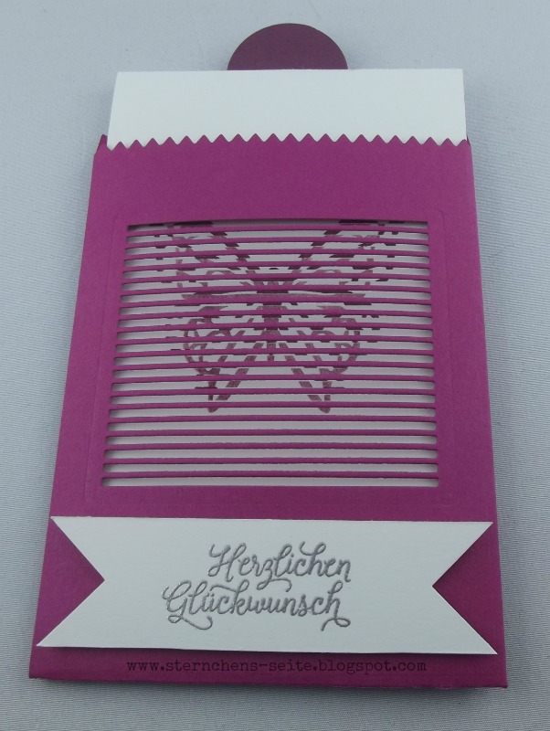 Die Idee die Karte aus der Mini-Leckereientüte zu ziehen, habe ich bei Sigrid *klick* bekommen. Sie hat dazu auch noch ein tolles Video gedreht wo ihr wunderbar den Effekt des sich bewegenden Schmetterlings sehen könnt. Auf meinen Fotos kommt das gar nicht so gut zur Geltung.